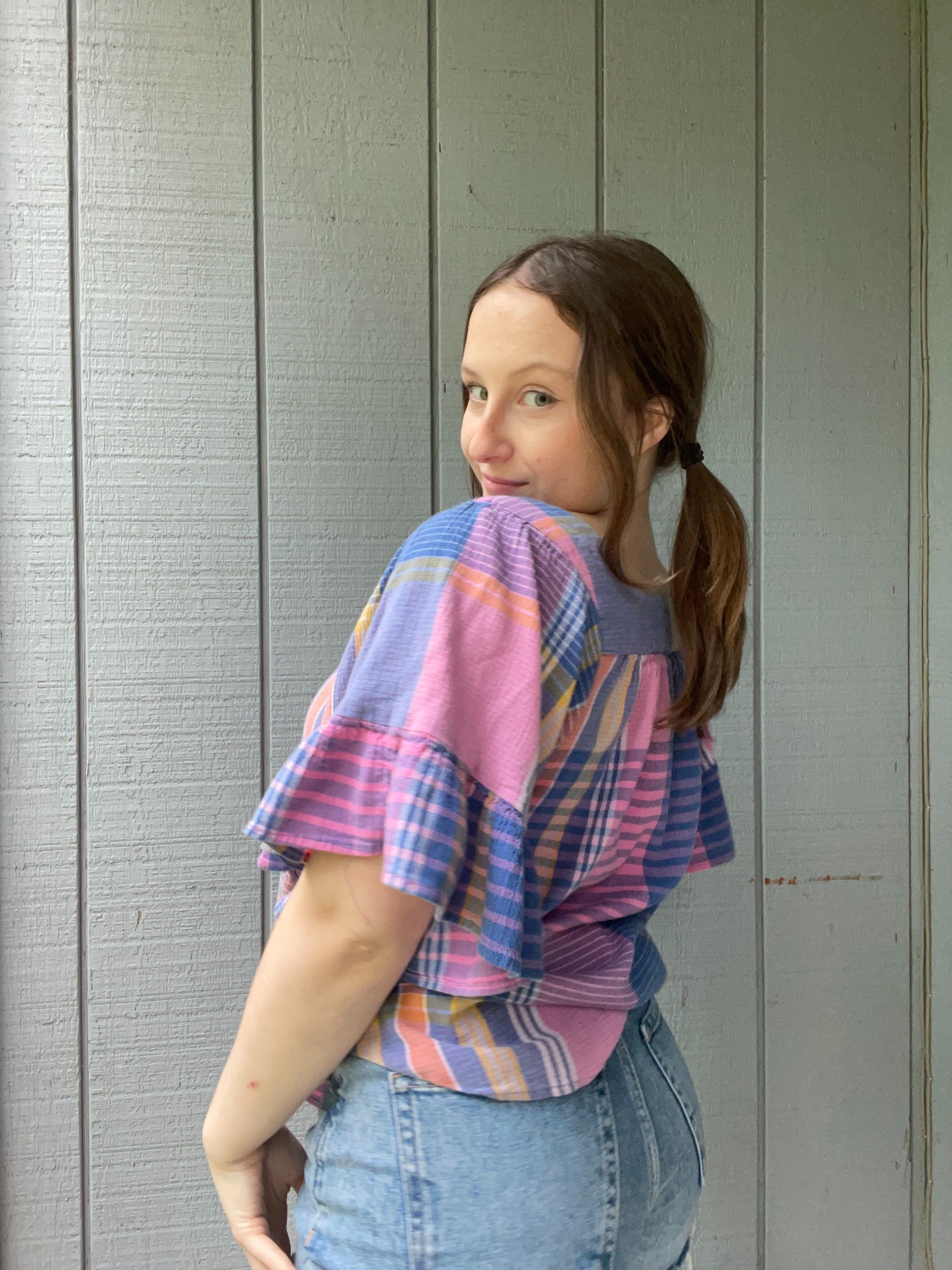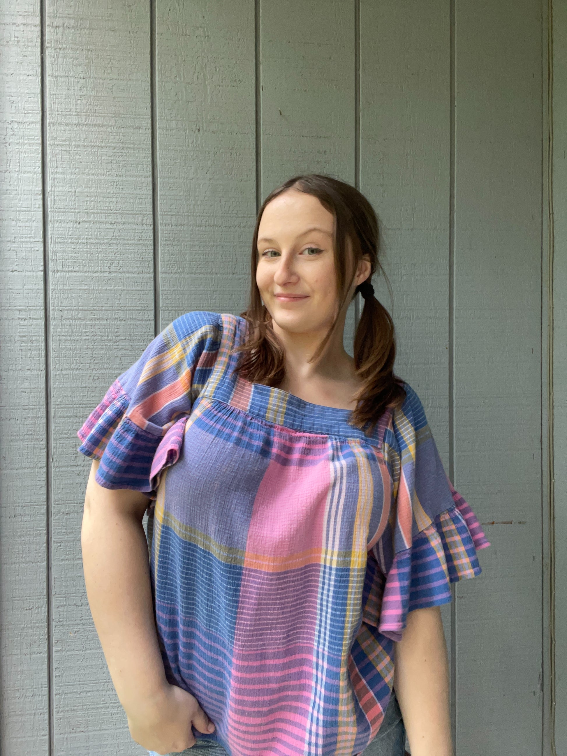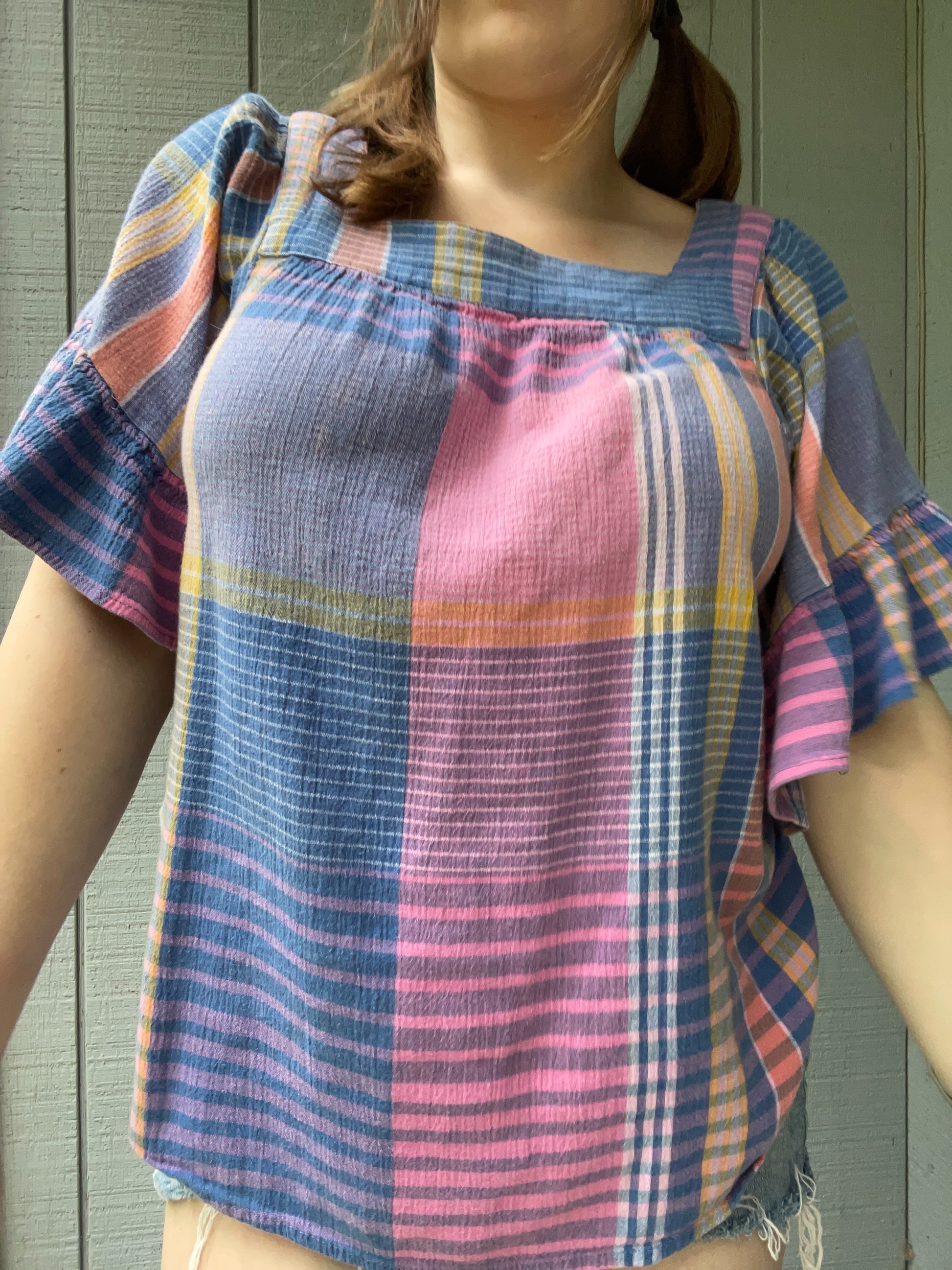 Blue Plaid Ruffle Blouse