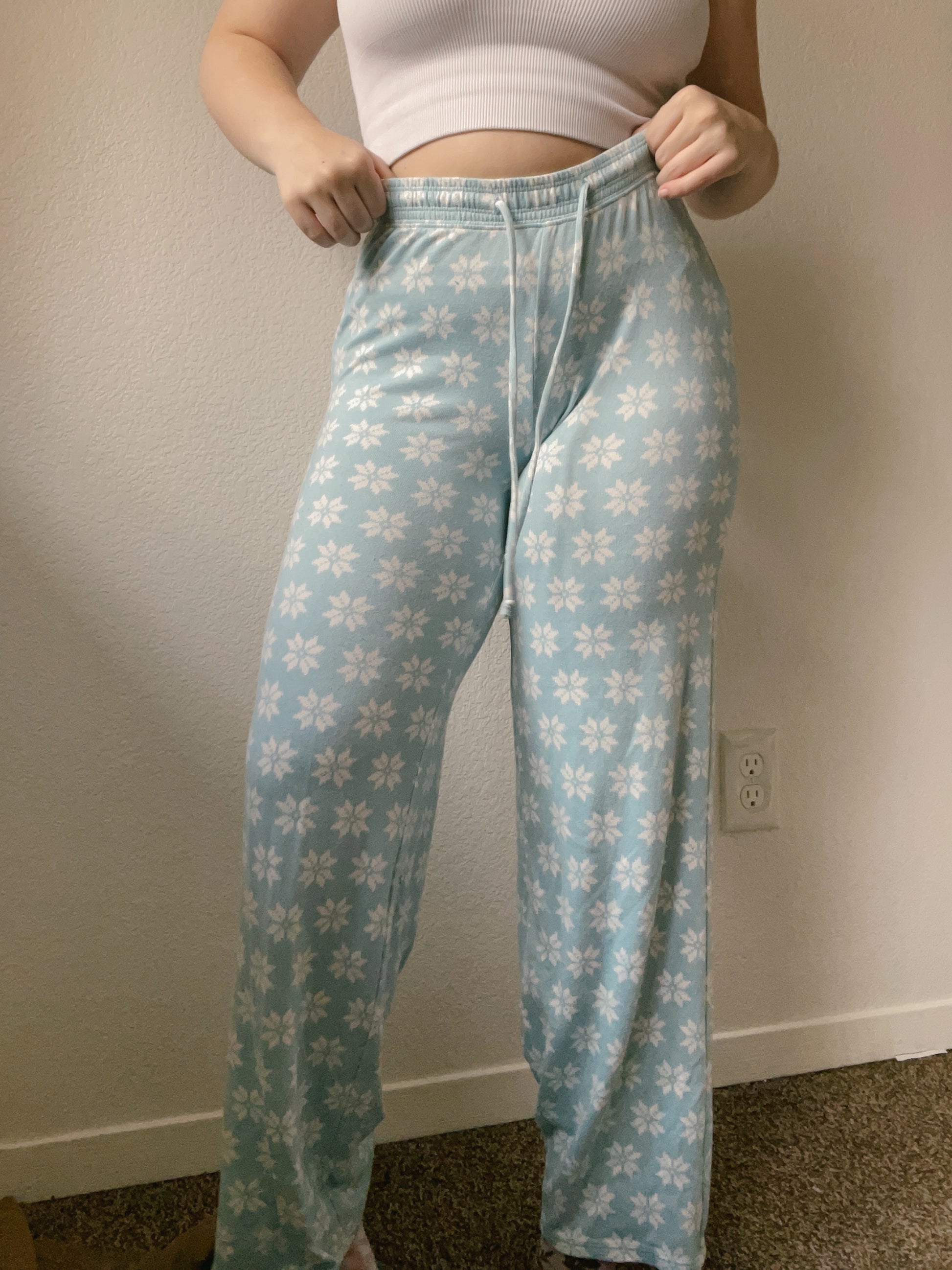 Get ready to snuggle up in these quirky Baby Blue Snowflake Pajama Pants from Gilly Hicks. With a playful snowflake print and jogger cuffs, these excellent condition pants also feature front pockets and a drawstring elastic waistline for ultimate comfort. A must-have for cozy nights in (with a hot cocoa in hand)!